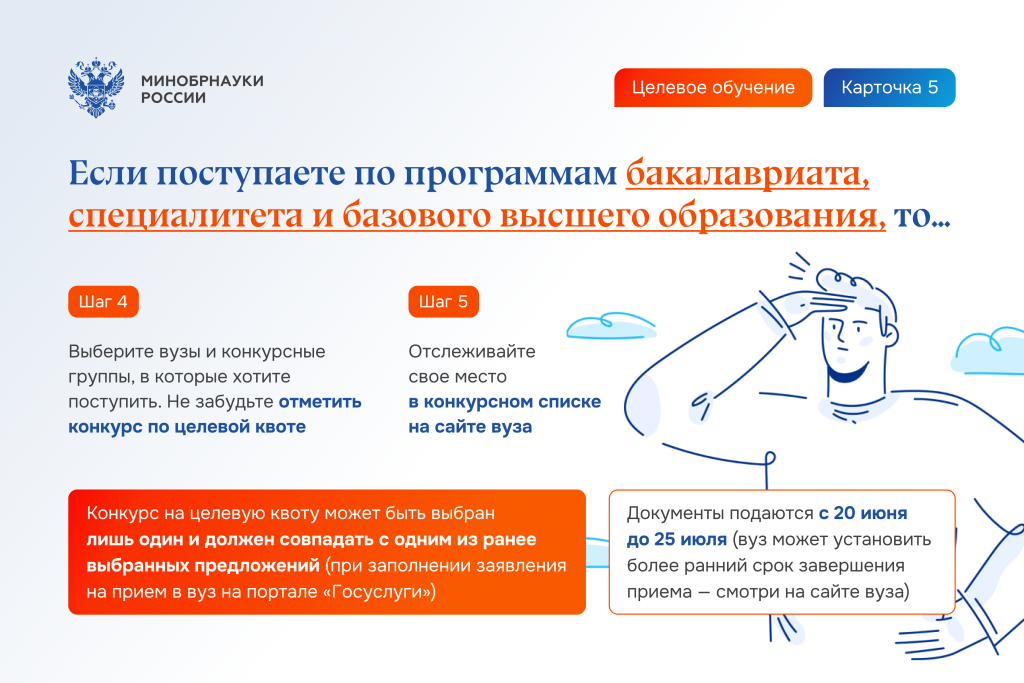 ! Конкурс на целевую квоту может быть выбран лишь один и должен совпадать с одним из ранее выбранных предложений (при заполнении заявления на прием в вуз на портале «Госуслуги»).