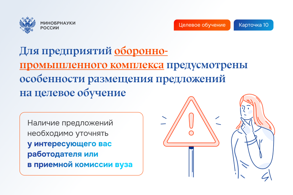 Для предприятий оборонно-промышленного комплекса предусмотрены особенности размещения предложений на целевое обучение. Наличие предложений необходимо уточнять у интересующего вас работодателя или в приемной комиссии вуза.
