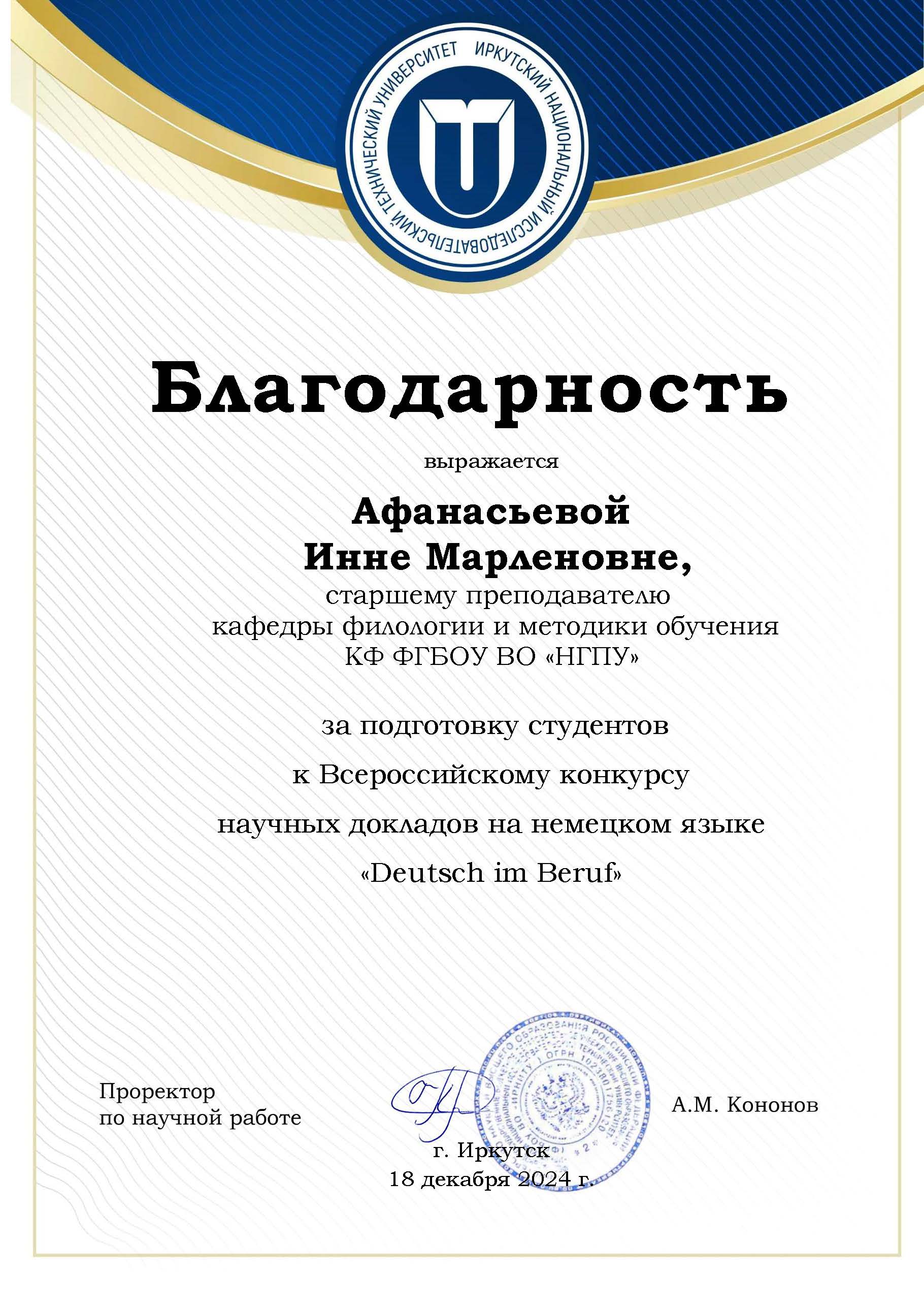 В декабре 2024 года в Институте лингвистики и межкультурной коммуникации Федерального государственного бюджетного образовательного учреждения высшего образования «Иркутский национальный исследовательский технический университет» проходил Всероссийский конкурс докладов на немецком языке «Deusch im Beruf», в котором под руководством старшего преподавателя кафедры ФиМО Афанасьевой И.М., приняла участие студентка IV курса Куйбышевского филиала ФГБОУ ВО «НГПУ», обучающаяся по профилям «Иностранный (английский) язык и Иностранный (немецкий) язык», Ветрова Александра.