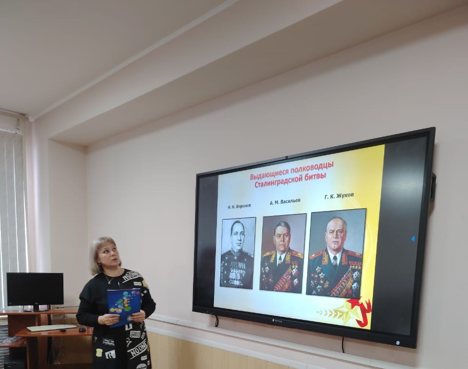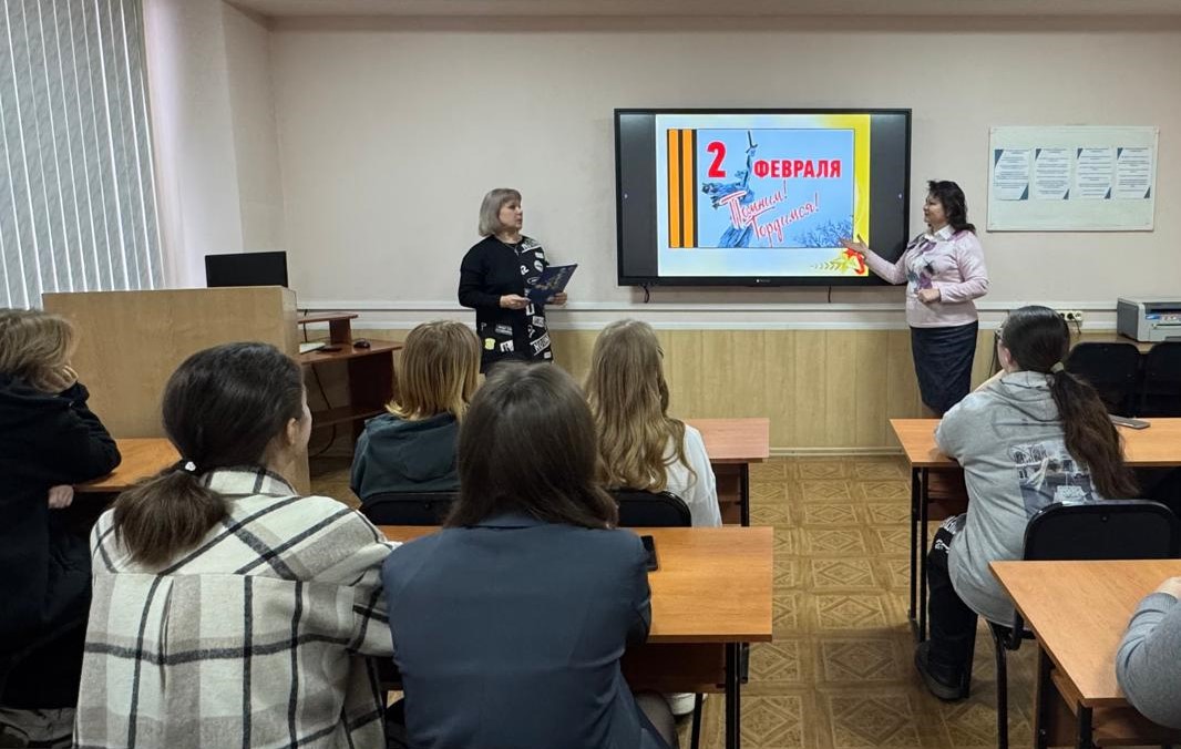 На информационном часе говорили о том, как досталась эта победа, о том, что Победа под Сталинградом подняла международный авторитет Советского Союза и его Вооруженных Сил, укрепила антигитлеровскую коалицию. Экскурс в историю Сталинградской битвы провела начальник отдела по воспитательной работе Козлова О.Б. Ее рассказ был наполнен глубоким уважением к подвигу советского народа и эмоциональностью, позволяющей прочувствовать трагедию и величие тех событий. В качестве соведущих на мероприятии выступили студенты старших курсов, внося свой вклад в создание атмосферы памяти и уважения. Выступления сопровождались демонстрацией снимков с места событий, исторических документов, которые позволили наглядно представить масштаб и ожесточенность боев за Сталинград. На мероприятии звучали имена героев, павших в боях за город, и говорилось об их бессмертных подвигах, ставших примером для будущих поколений. Особое внимание было уделено героизму защитников знаменитого «дома Павлова» и подвигу Михаила Паникахи, чье самопожертвование стало символом стойкости и мужества.