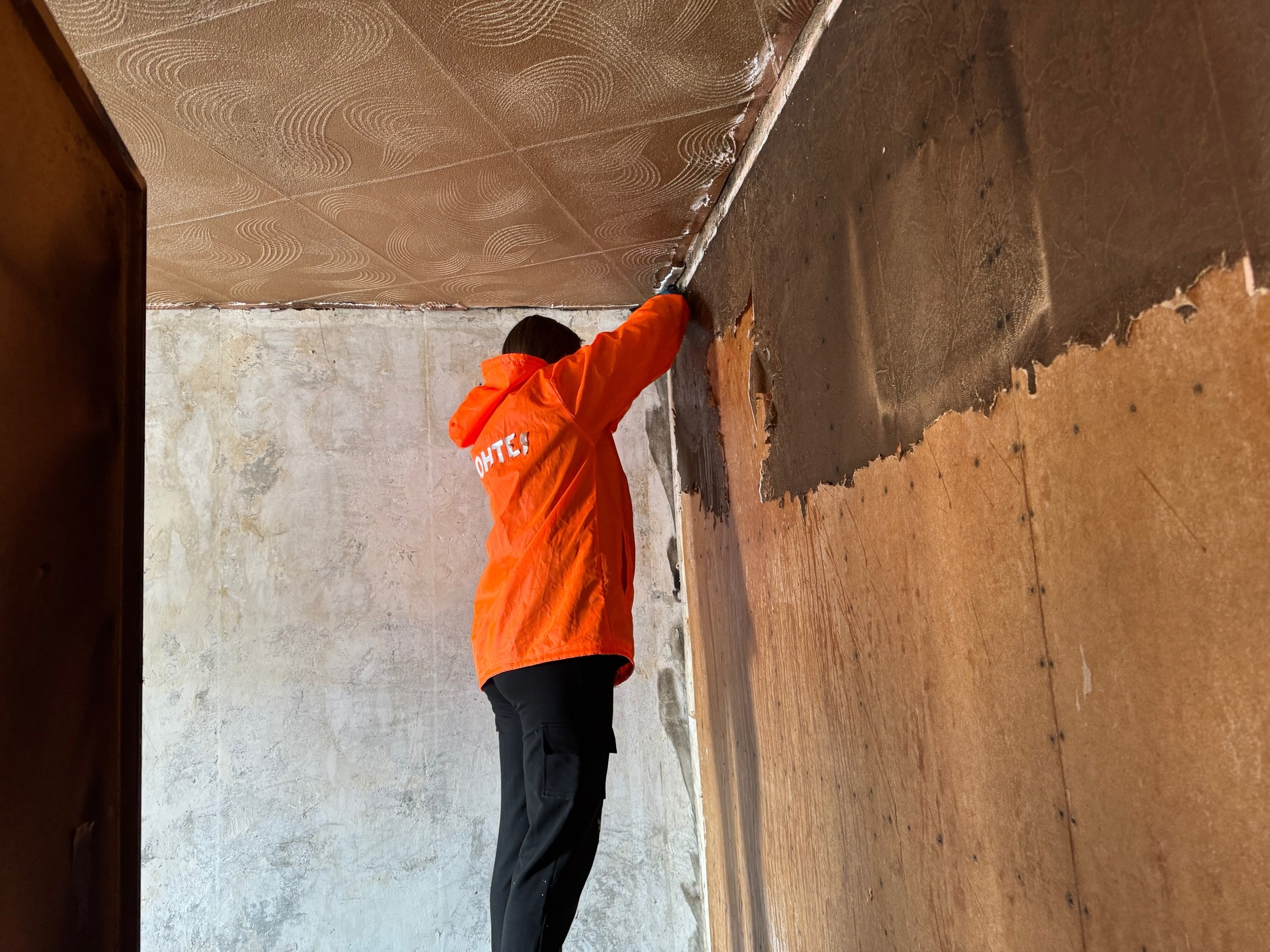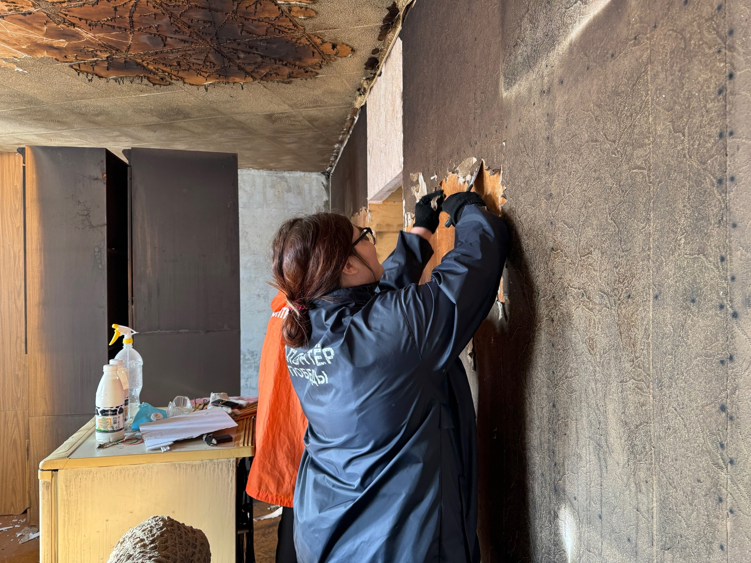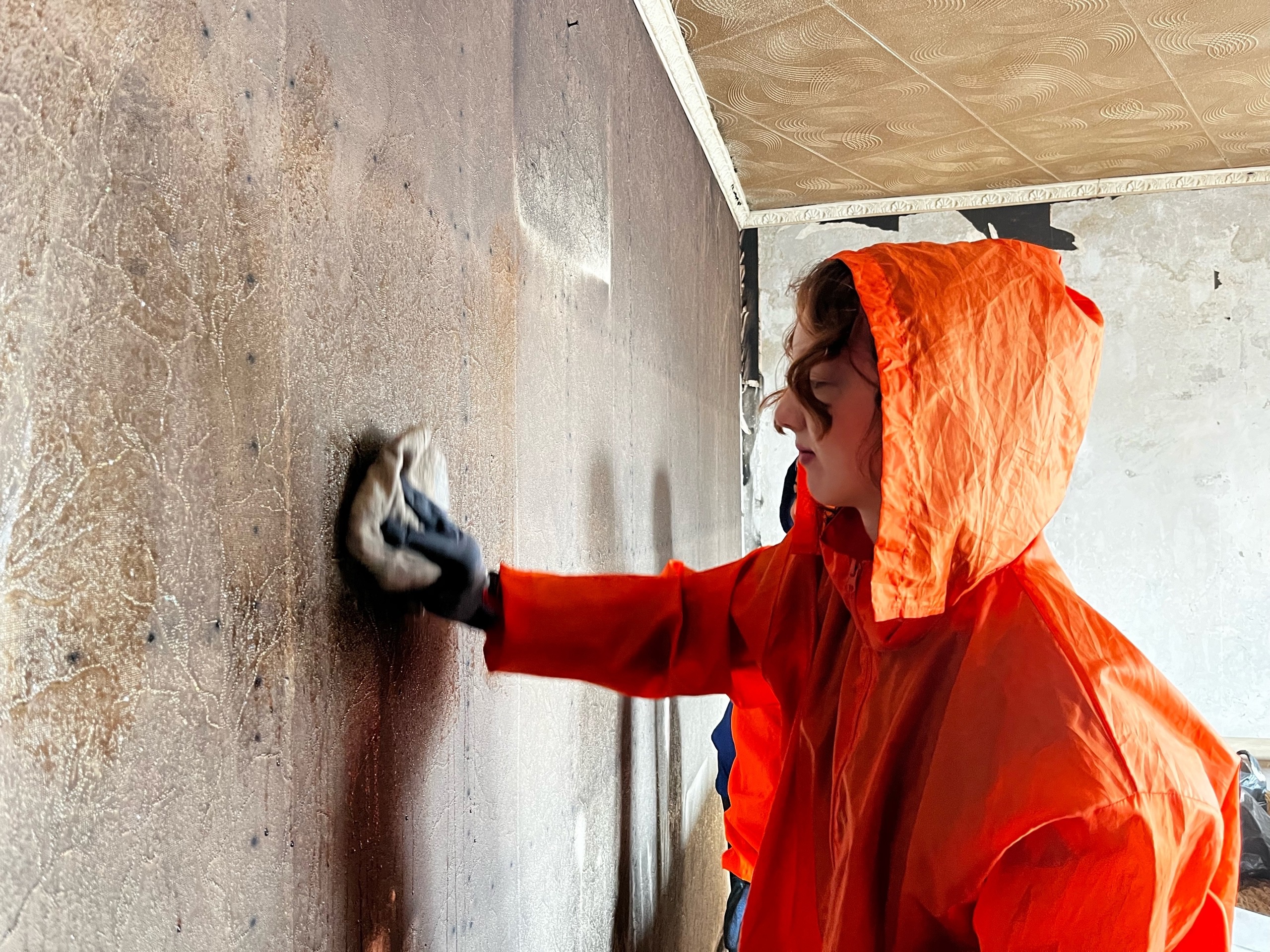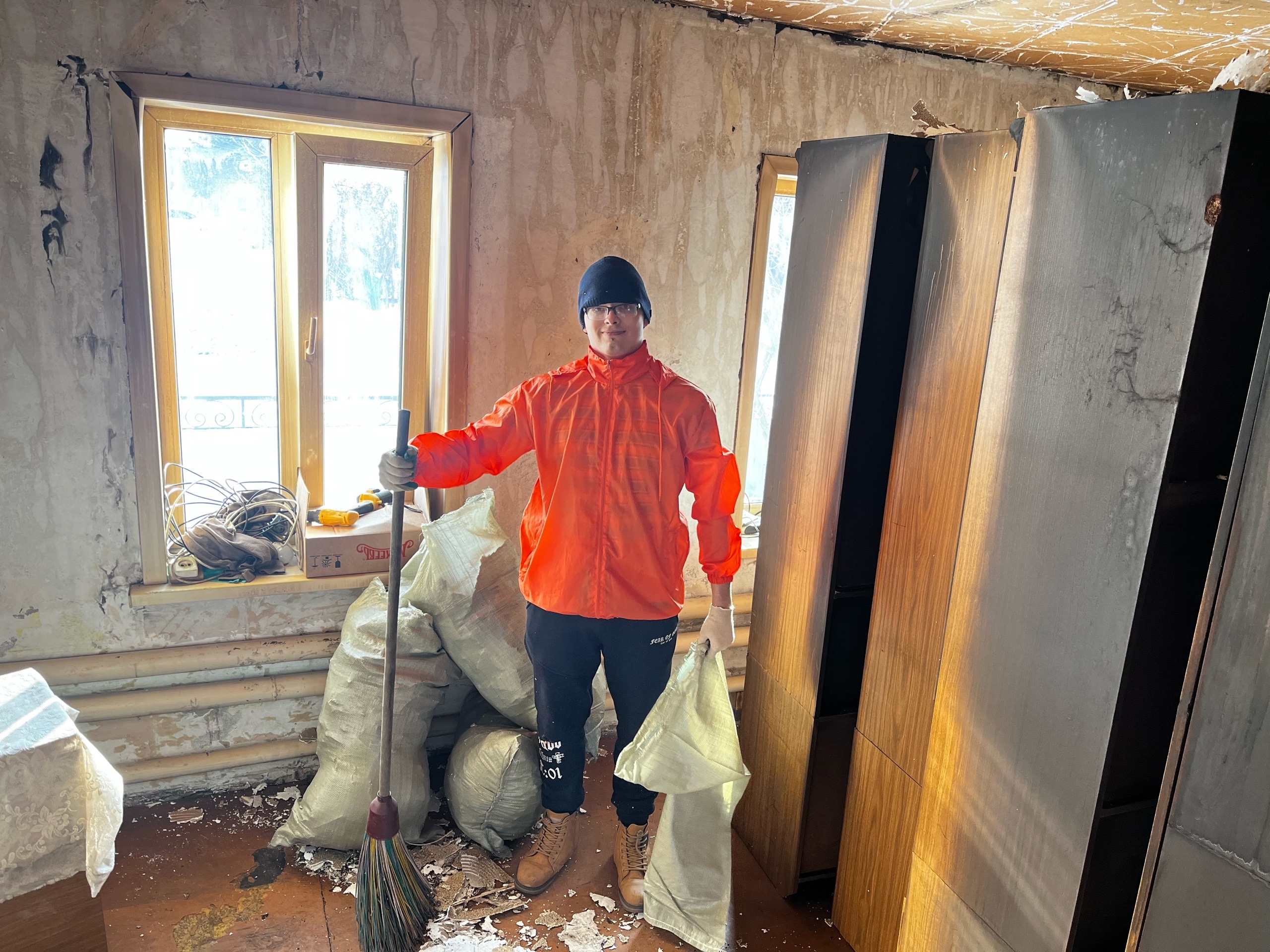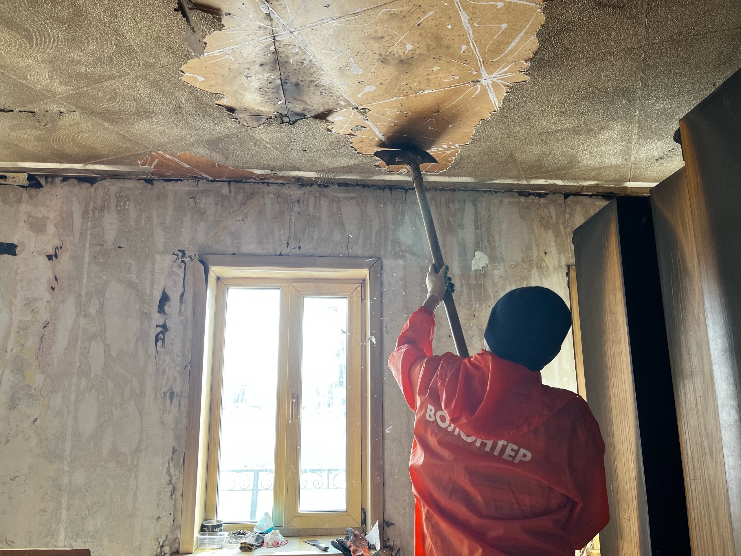 Волонтёры, оперативно отреагировав на просьбу о помощи, незамедлительно приступили к уборке в доме. Они самоотверженно сняли старые обои, демонтировали повреждённый потолок и тщательно очистили комнаты, подготовив жильё к предстоящему ремонту.