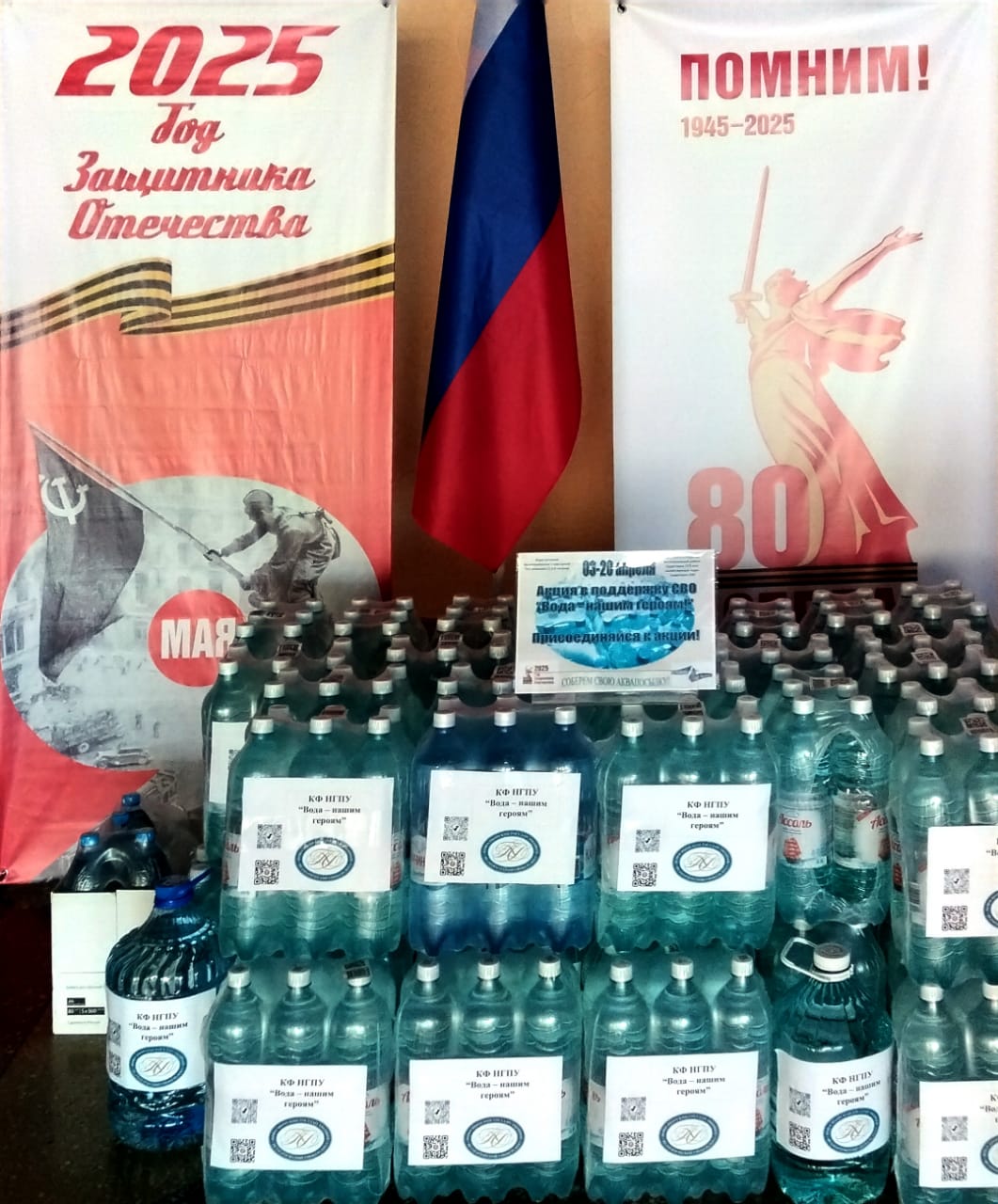 Регулярные отправки гуманитарной помощи стали доброй традицией. В апреле этого года была проведена благотворительная акция по сбору питьевой воды на фронт. Объединив усилия студентов, преподавателей и сотрудников, удалось собрать целых 280 литров чистой, питьевой воды! 17 апреля 2025 года партия воды была передана в штаб движения тылового фронта «Крылья Ангела» и в ближайшее время отправится на передовую.
