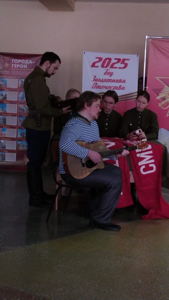 Фойе превратилось в импровизированный блиндаж. Временное затишье между боями, солдаты, мечтающие о концерте… И вот, на импровизированную сцену прибывают настоящие артисты. Клавдия Шульженко (в исполнении Милены Яблоковой) трогает сердца «Синим платочком», Лидия Русланова (Мария Драйлинг) задорно выводит знаменитые «Валенки», Вера Красовицкая (Алина Гаценбиллер) радует зрителей «Катюшей», и все присутствующие, как один, подхватывают знакомую мелодию. Семен Кирсанов и Валентина Серова (в исполнении Баклагина Владислава и Гуренчик Софьи) проникновенно читают стихи о войне, а Михаил Жаров (Кирилл Прут) радует бойцов задорными частушками. В роли солдат выступили Черкесова Галина, Просолупов Никита, Салина Юлия, Усванов Евгений).