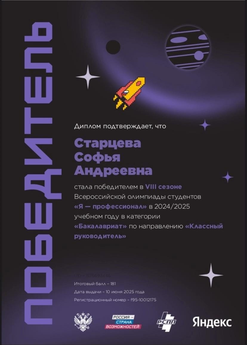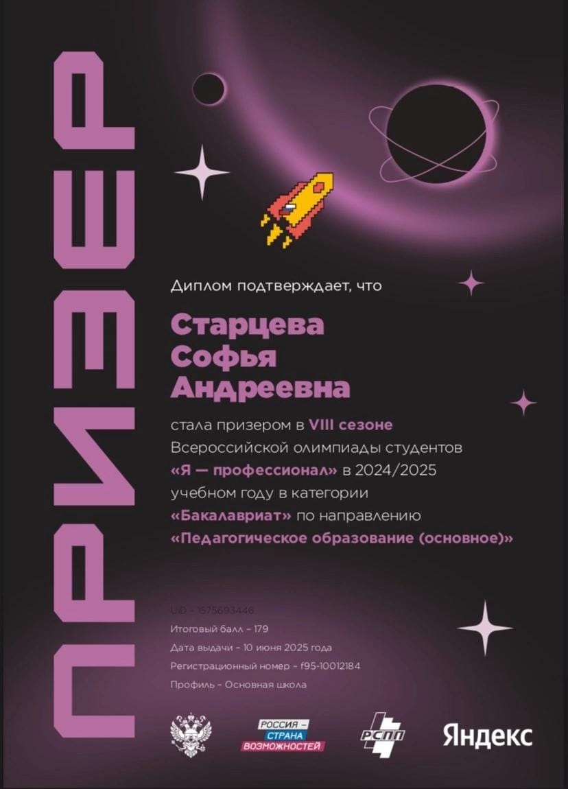 Старцева Софья (профиль: Математика и Информатика, 4 курс) – победитель VIII сезона Всероссийской олимпиады студентов «Я-профессионал» по направлению «Классное руководство»;