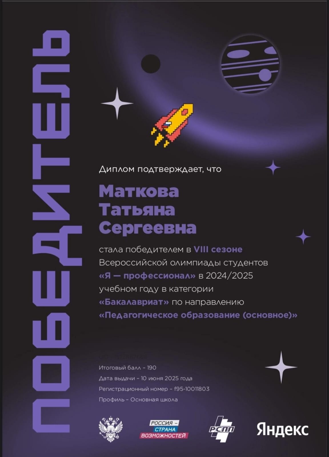 Маткова Татьяна: «Участие в Олимпиаде «Я – профессионал» стало для меня уникальной возможностью выйти за рамки привычного обучения и проверить свои силы в совершенно иной среде. Благодаря качественной подготовке преподавателей я легко справилась со всеми заданиями и чувствовала себя уверенно даже с сильными соперниками. Эта олимпиада позволила мне познакомиться с единомышленниками из разных уголков страны, зарядила меня мотивацией, уверенностью и желанием развиваться дальше, а также предоставила возможность претендовать на льготы при поступлении в магистратуру. Огромное спасибо университету за такую возможность! Теперь я с ещё большим энтузиазмом буду стремиться к новым вершинам».
