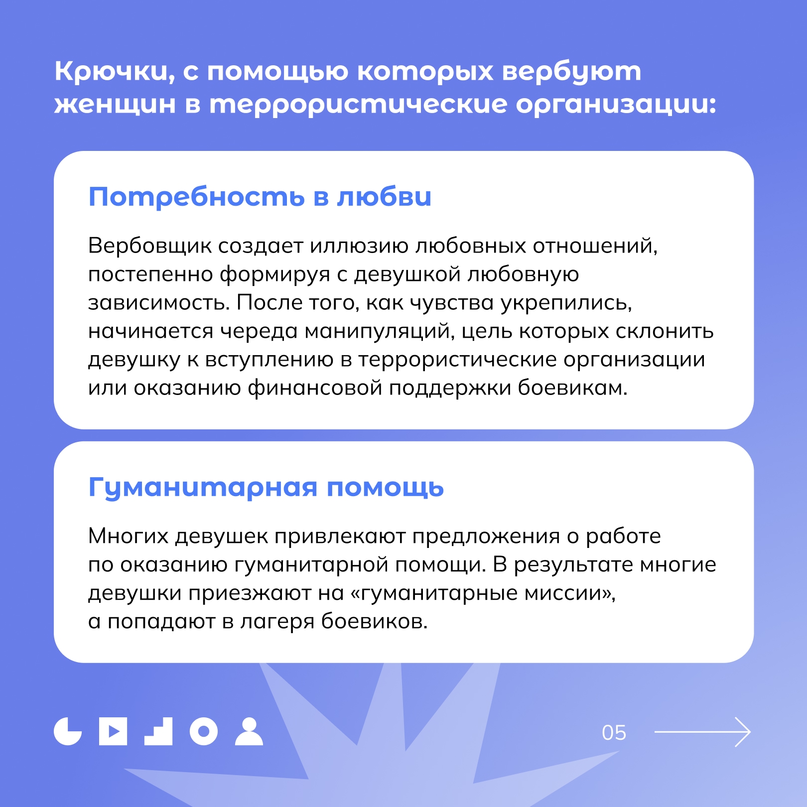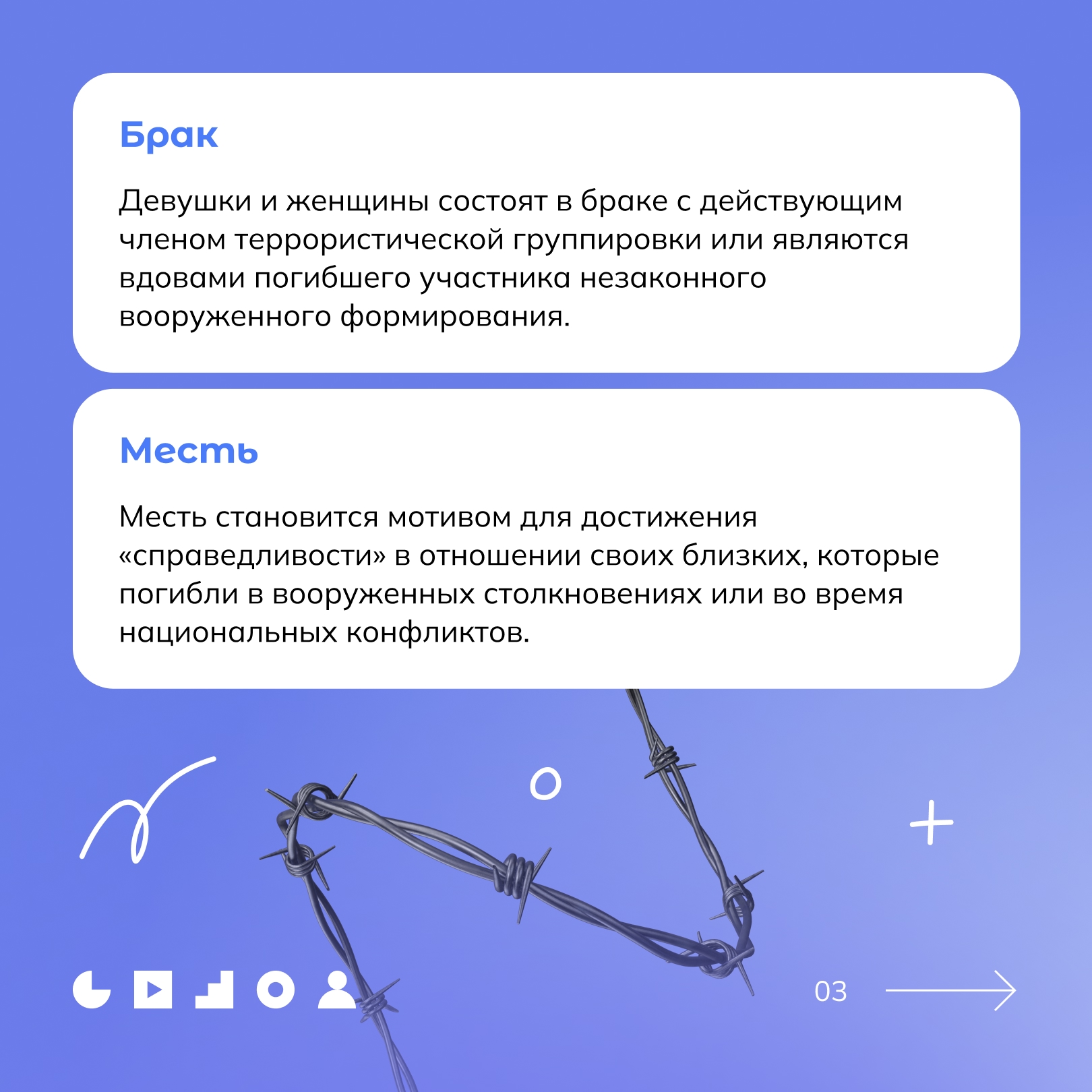Несмотря на распространенный стереотип, среди террористов также можно встретить и женщин. Как молодые девушки и женщины становятся участниками террористических актов? Какие крючки давления используют вербовщики? Рассмотрим в карточках.
