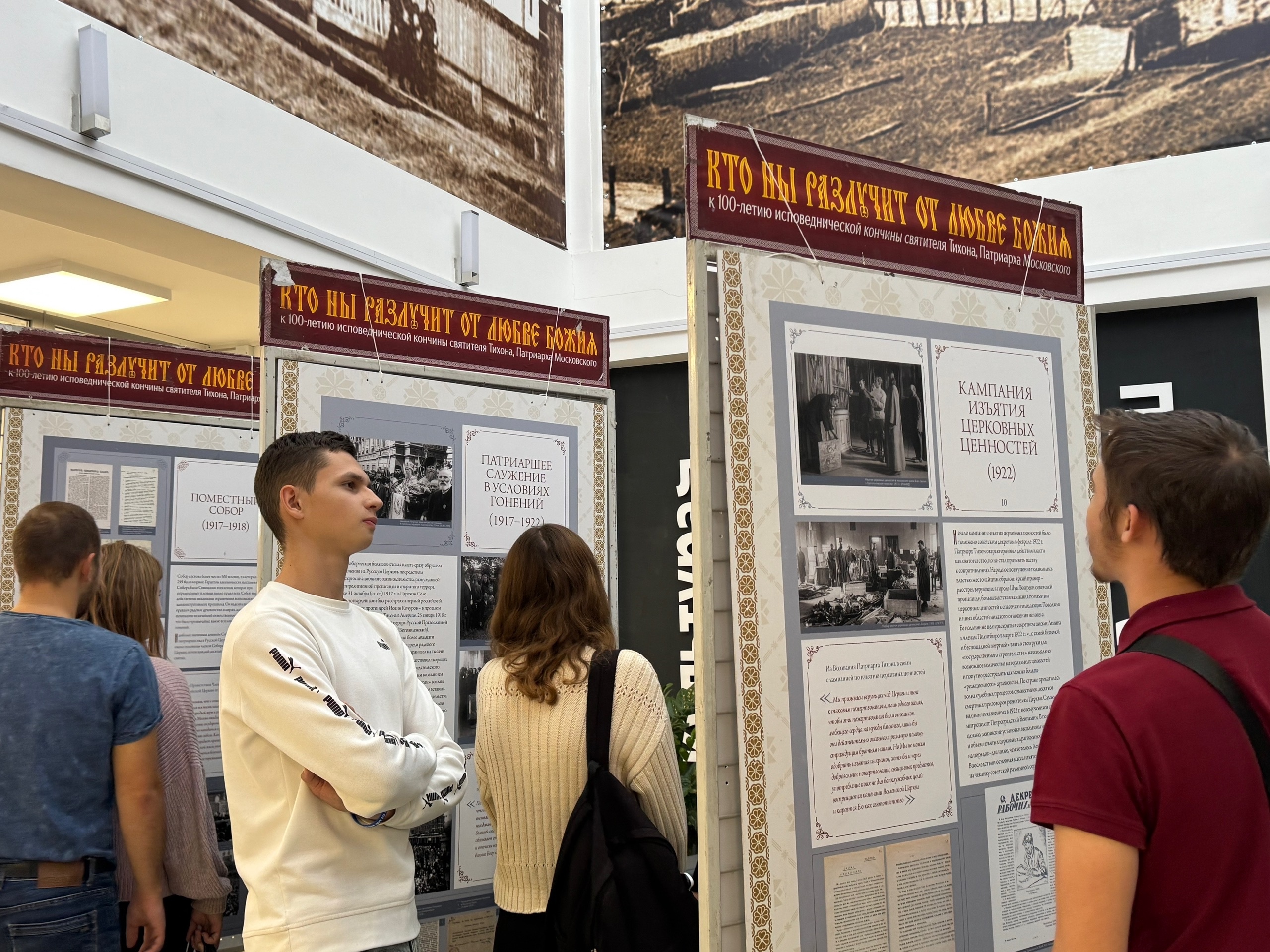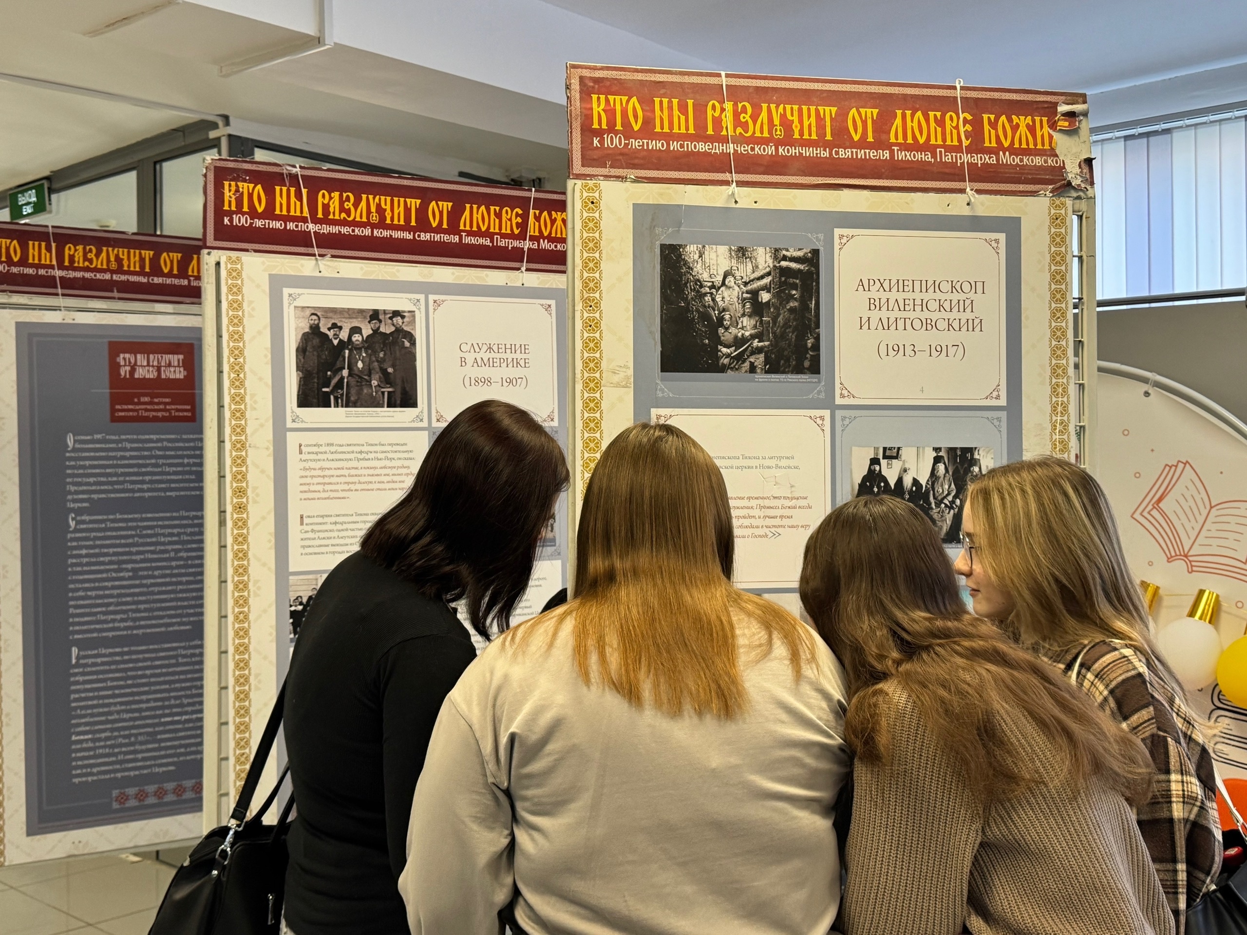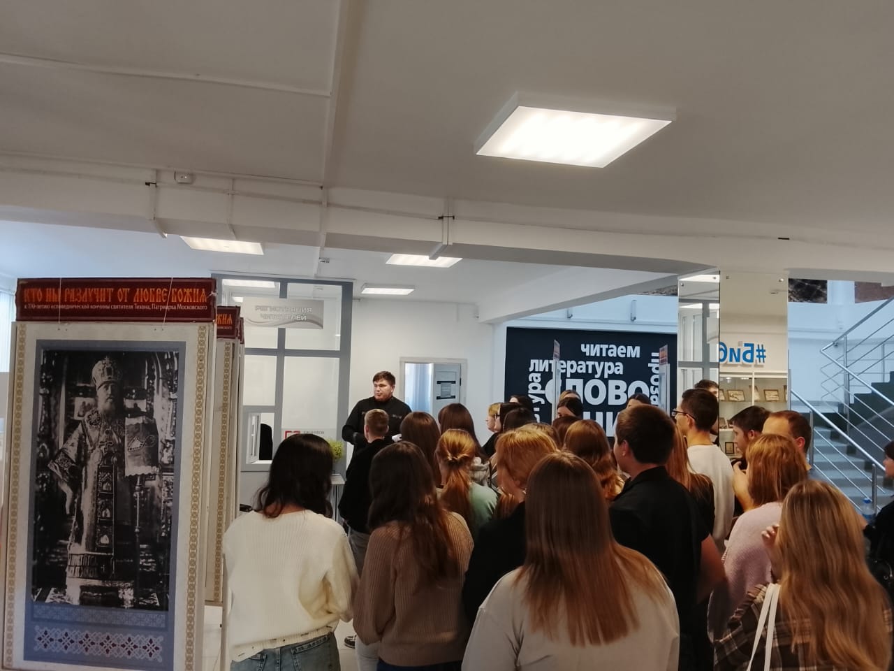 Обзорную экскурсию для студентов провел иерей Павел Говоров. Он подробно рассказал о материалах выставки, которые раскрывают весь жизненный путь и духовный подвиг Патриарха Тихона. Студенты узнали, что святитель был человеком удивительной кротости и смирения, в котором его современники видели истинное величие и силу Божию. Отец Павел подчеркнул, что сегодня служение Патриарха Тихона является ярким примером мужества, верности Церкви и самоотверженного служения вере и Отечеству в один из самых сложных периодов российской истории.