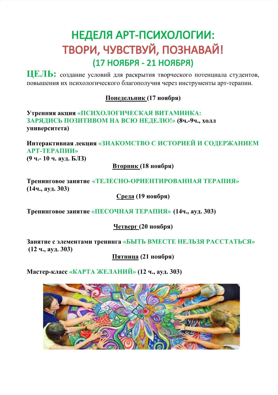 Кафедра психологии и педагогики с радостью приглашает вас принять участие в Неделе арт-психологии, которая пройдет с 17 по 21 ноября 2025 года.