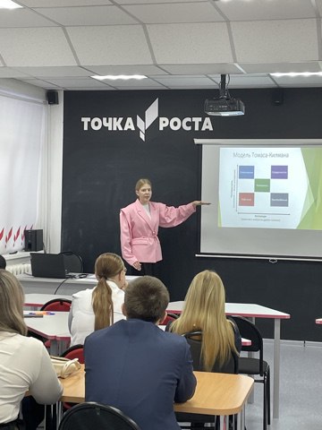 Замечательно отработала со старшеклассниками Орлова Екатерина, перед которой была поставлена непростая задача: познакомить ребят со стратегиями поведения в конфликтной ситуации. Катя не только подобрала необходимый материал для работы, но и удачно его структурировала. И это при условии, что «Основы конфликтологии» будут изучаться только на 4 курсе! Школьникам были предложены для решения кейсы, которые они не просто решили в микрогруппах, но и удачно разыграли, что очень оживило занятие.